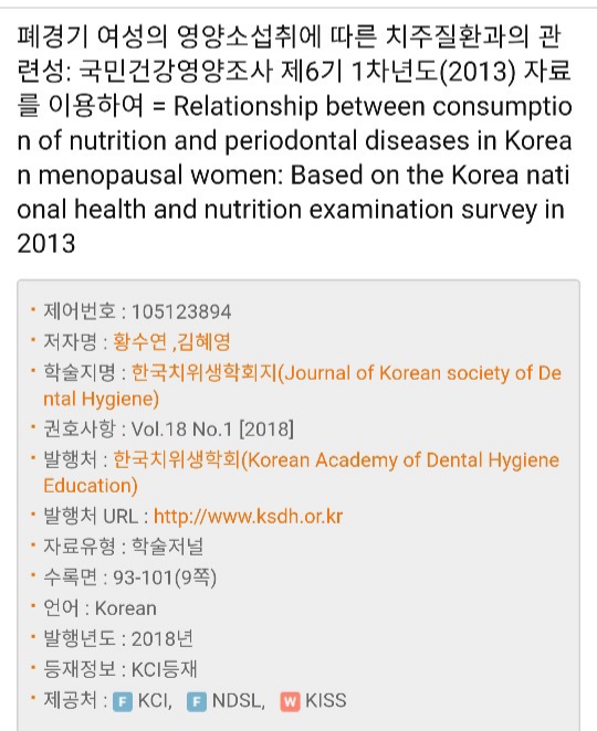 한국치위생학회지 18권 1회에(Vol.18, No1.) 수록된 " 폐경기 여성의 영양소섭취에 따른 치주질환과의 관련성:국민건강영양조사 제6기 1차년도(2013) 자료를 이용하여" 논문(저자 :황수연)이 2019 대한민국과학기술연차대회에서 “과학기술우수논문상”을 수상하였다.