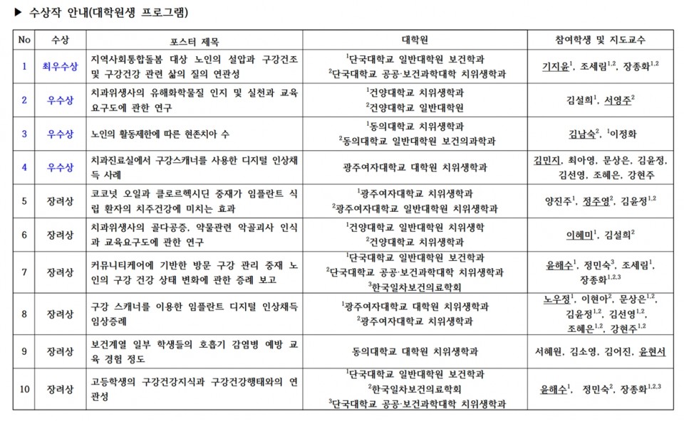 아울러 일반 회원의 포스터 수상작에 대해서도 함께 안내하오니 참고하시기 바라며, 앞으로도 한국치위생학회 대학원생 및 신진과학자 프로그램에 지속적인 관심과 참여 부 탁드립니다.