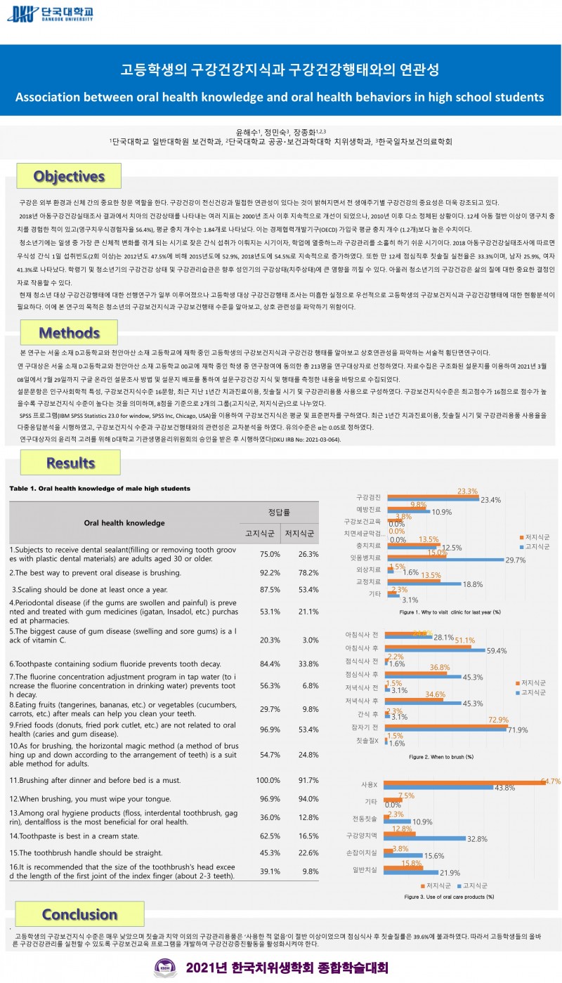 2021 종합학술대회 회원포스터 21. 고등학생의 구강건강지식과 구강건강행태와의 연관성 페이지 정보 작성자 한국치위생학회 작성일21-10-30 21:35 조회965회 댓글0건 관련링크 이전글 다음글 목록 본문 2021 종합학술대회 회원포스터 21. 고등학생의 구강건강지식과 구강건강행태와의 연관성 [이 게시물은 한국치위생학회님에 의해 2021-10-30 21:44:08 학술대회참가용 자료에서 복사 됨] 댓글목록 등록된 댓글이 없습니다. 이전글 다음글 목록