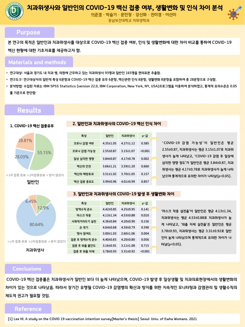 2021 종합학술대회 학생포스터 50. 치과위생사와 일반인의 COVID-19 백신 접종 여부, 생활변화 및 인식 차이 분석