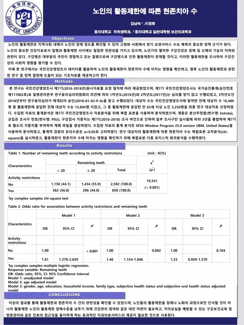 2021 종합학술대회 회원포스터 3. 노인의 활동제한에 따른 현존치아 수 페이지 정보 작성자 한국치위생학회 작성일21-10-30 21:27 조회974회 댓글0건 관련링크 이전글 다음글 목록 본문 2021 종합학술대회 회원포스터 3. 노인의 활동제한에 따른 현존치아 수 [이 게시물은 한국치위생학회님에 의해 2021-10-30 21:45:20 학술대회참가용 자료에서 복사 됨] 댓글목록 등록된 댓글이 없습니다. 이전글 다음글 목록
