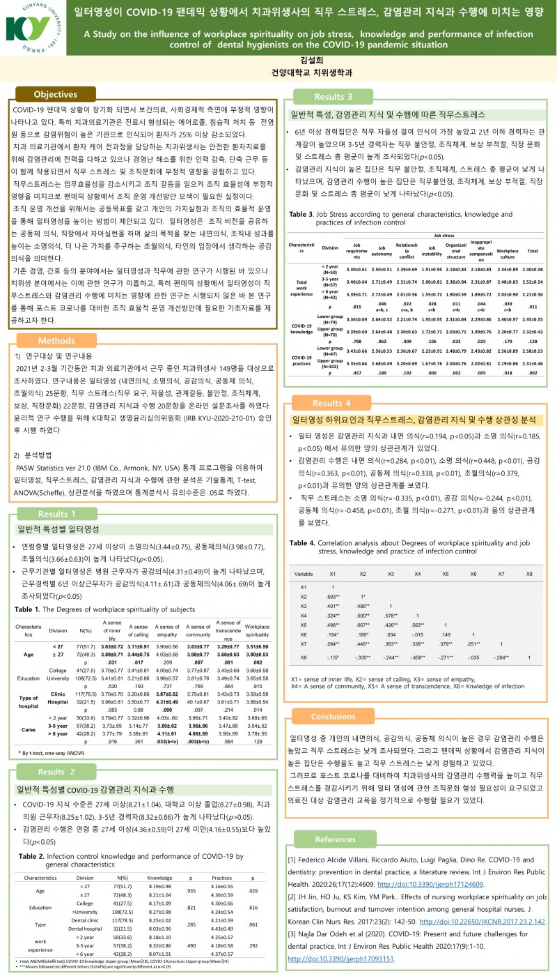 2021 종합학술대회 회원포스터 7. 일터 영성이 COVID 19 팬데믹 상황에서 치과위생사의 직무 스트레스, 감염관리 지식과 수행에 미치는 영향