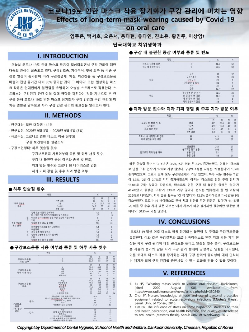 33.코로나19로 인한 마스크 착용 장기화가 구강 관리에 미치는 영향 페이지 정보 작성자 한국치위생학회 작성일20-11-01 21:34 조회1,169회 댓글0건 관련링크 이전글 다음글 목록 본문 33.코로나19로 인한 마스크 착용 장기화가 구강 관리에 미치는 영향 댓글목록 등록된 댓글이 없습니다. 이전글 다음글 목록