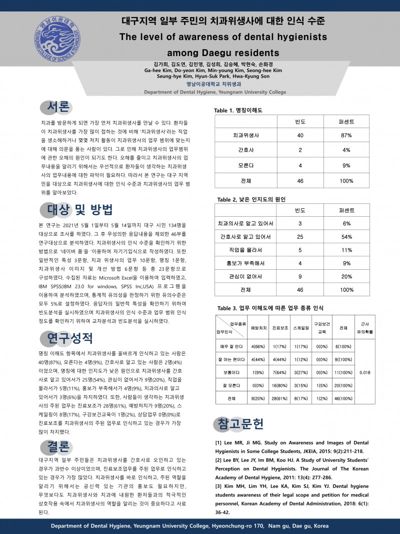 2021 종합학술대회 학생포스터 30. 대구지역 일부 주민의 치과위생사에 대한 인식 수준 페이지 정보 작성자 한국치위생학회 작성일21-10-30 21:15 조회1,161회 댓글0건 관련링크 이전글 다음글 목록 본문 2021 종합학술대회 학생포스터 30. 대구지역 일부 주민의 치과위생사에 대한 인식 수준 [이 게시물은 한국치위생학회님에 의해 2021-10-30 21:46:46 학술대회참가용 자료에서 복사 됨] 댓글목록 등록된 댓글이 없습니다. 이전글 다음글 목록