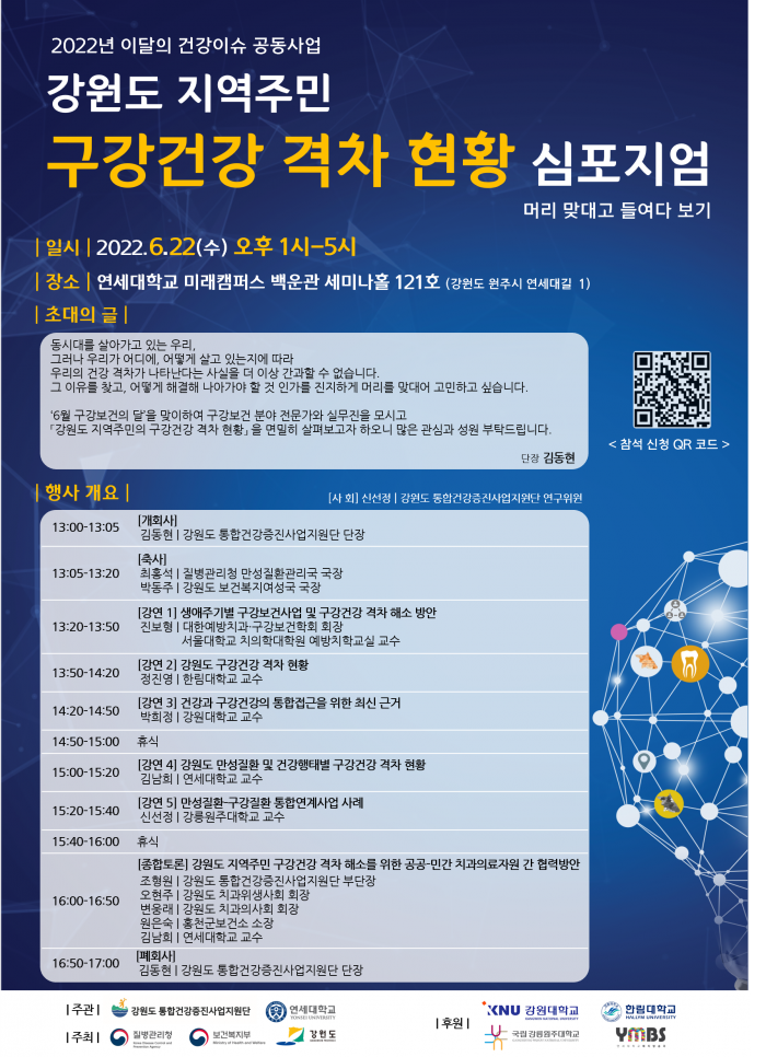 <강원도 통합건강증진사업지원단>과 <강원도 구강건강 격차연구팀>이 공동 주관하는 심포지엄 정보를 공유드리며, 정중히 초대하고자 메일드립니다.