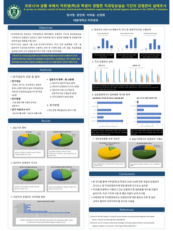 2021 종합학술대회 학생포스터 45. 코로나19 상황 속에서 치위생(학)과 학생이 경험한 치과임상실습 기관의 감염관리 실태조…