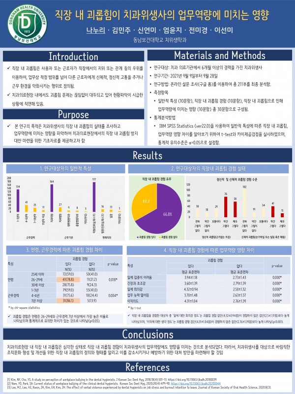 2021 종합학술대회 학생포스터 49. 직장 내 괴롭힘이 치과위생사의 업무역량에 미치는 영향