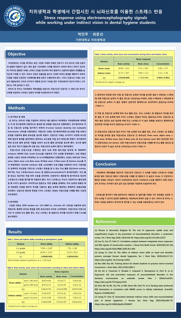 2022 춘계학술대회 회원포스터 6. 치위생학과 학생에서 간접시진 시 뇌파신호를 이용한 스트레스 반응 페이지 정보 작성자 한국치위생학회 작성일22-05-12 23:43 조회3,171회 댓글0건 관련링크 이전글 다음글 목록 본문 6. 치위생학과 학생에서 간접시진 시 뇌파신호를 이용한 스트레스 반응 [이 게시물은 한국치위생학회님에 의해 2022-05-13 00:09:57 학술대회참가용 자료에서 복사 됨] 댓글목록 등록된 댓글이 없습니다. 이전글 다음글 목록