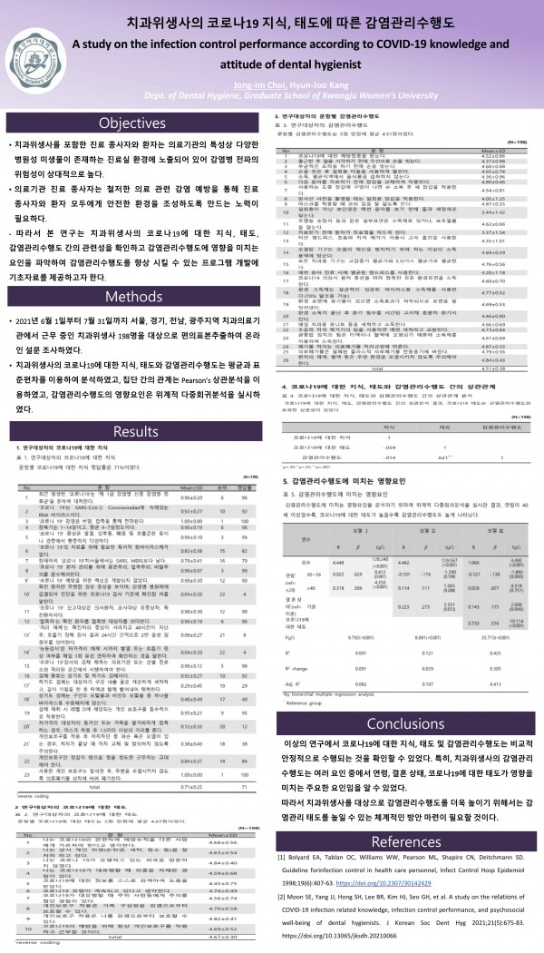 2022 춘계학술대회 회원포스터 12. 치과위생사의 코로나19 지식, 태도에 따른 감염관리수행도 페이지 정보 작성자 한국치위생학회 작성일22-05-12 23:47 조회3,078회 댓글0건 관련링크 이전글 다음글 목록 본문 12. 치과위생사의 코로나19 지식, 태도에 따른 감염관리수행도 [이 게시물은 한국치위생학회님에 의해 2022-05-13 00:09:57 학술대회참가용 자료에서 복사 됨] 댓글목록 등록된 댓글이 없습니다. 이전글 다음글 목록