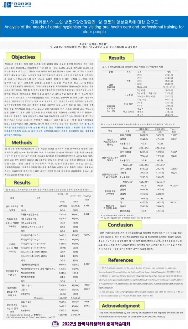 2022 춘계학술대회 15. 치과위생사의 노인 방문구강건강관리 및 전문가 양성교육에 대한 요구도 페이지 정보 작성자 한국치위생학회 작성일22-05-12 23:52 조회3,255회 댓글0건 관련링크 이전글 다음글 목록 본문 2022 춘계학술대회 15. 치과위생사의 노인 방문구강건강관리 및 전문가 양성교육에 대한 요구도 [이 게시물은 한국치위생학회님에 의해 2022-05-13 00:09:57 학술대회참가용 자료에서 복사 됨] 댓글목록 등록된 댓글이 없습니다. 이전글 다음글 목록