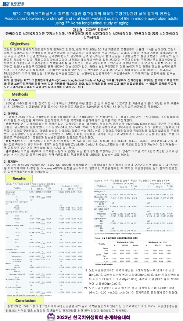 2022 춘계학술대회 20. 제7기 고령화연구패널조사 자료를 이용한 중고량자의 악력과 구강건강관련 삶의 질과의 연관성