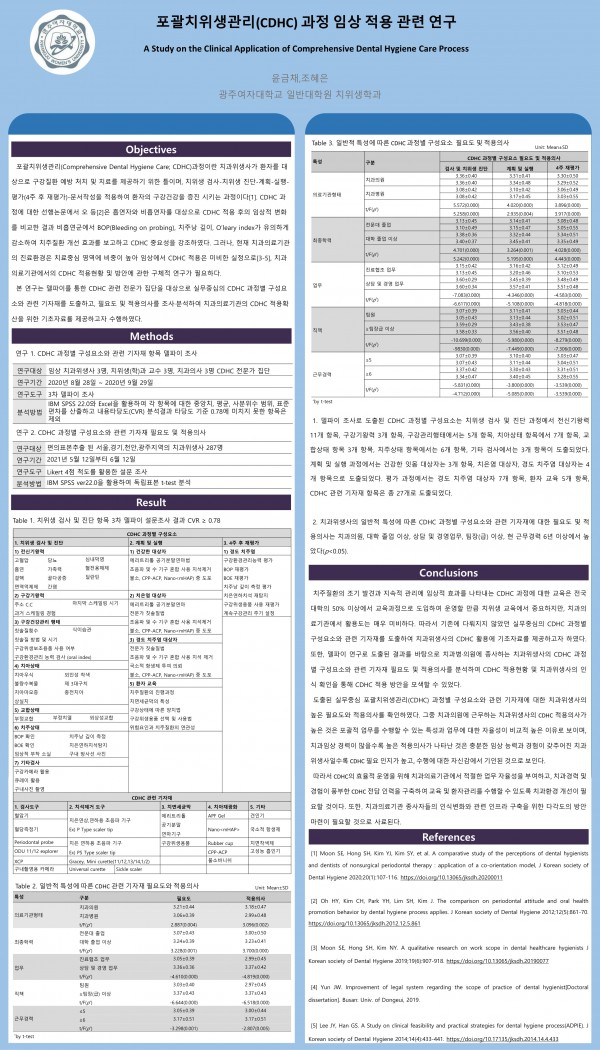 2022 춘계학술대회 26. 포괄치위생관리(CDHC) 과정 임상 적용 관련 연구 페이지 정보 작성자 한국치위생학회 작성일22-05-13 00:02 조회3,258회 댓글0건 관련링크 이전글 다음글 목록 본문 26. 포괄치위생관리(CDHC) 과정 임상 적용 관련 연구 [이 게시물은 한국치위생학회님에 의해 2022-05-13 00:10:16 학술대회참가용 자료에서 복사 됨] 댓글목록 등록된 댓글이 없습니다. 이전글 다음글 목록