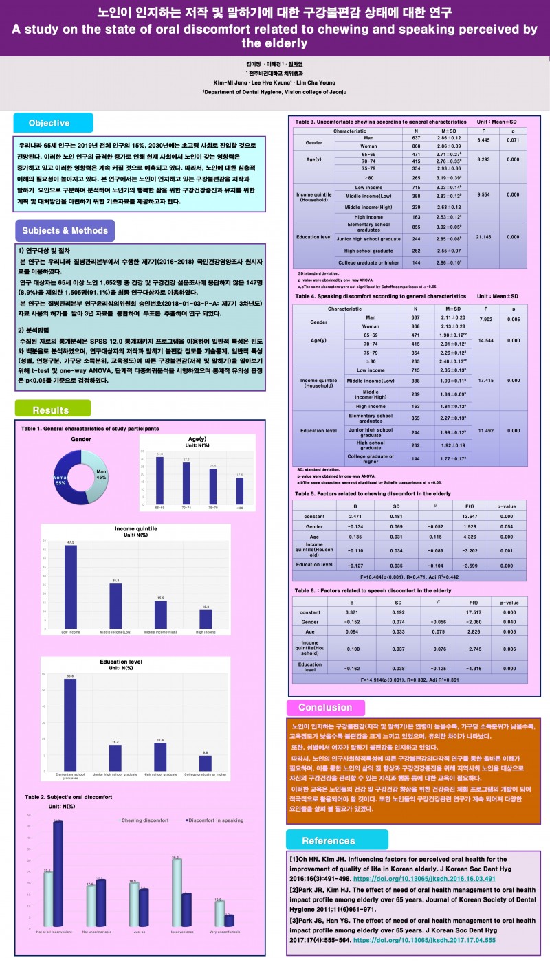 회원08.노인이 인지하는 저작 및 말하기에 대한 구강불편감 상태에 대한 연구 페이지 정보 작성자 한국치위생학회 작성일20-11-01 22:38 조회1,464회 댓글0건 관련링크 이전글 다음글 목록 본문 회원08.노인이 인지하는 저작 및 말하기에 대한 구강불편감 상태에 대한 연구 댓글목록 등록된 댓글이 없습니다. 이전글 다음글 목록