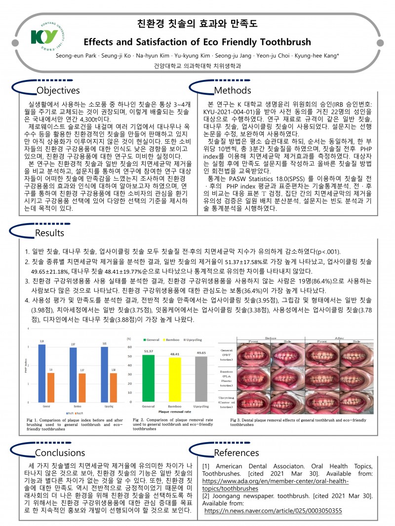 2021 종합학술대회 학생포스터 11. 친환경 칫솔의 효과와 만족도 페이지 정보 작성자 한국치위생학회 작성일21-10-30 20:37 조회1,153회 댓글0건 관련링크 이전글 다음글 목록 본문 2021 종합학술대회 학생포스터 11. 친환경 칫솔의 효과와 만족도 [이 게시물은 한국치위생학회님에 의해 2021-10-30 21:47:16 학술대회참가용 자료에서 복사 됨] 댓글목록 등록된 댓글이 없습니다. 이전글 다음글 목록