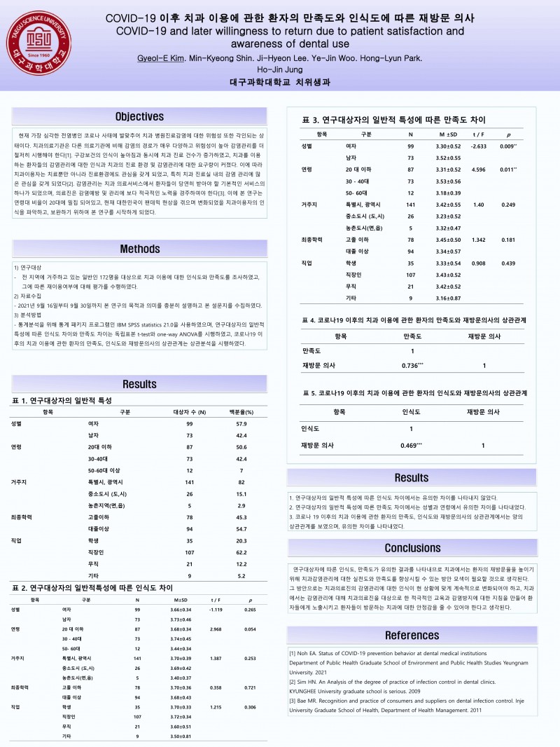2021 종합학술대회 학생포스터 12. COVID-19 이후 치과 이용에 관한 환자의 만족도와 인식도에 따른 재방문 의사