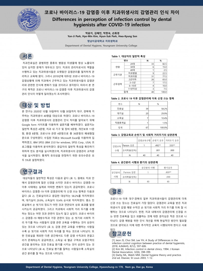 2021 종합학술대회 학생포스터 24. 코로나 바이러스-19 감염증 이후 치과위생사의 감염관리 인식 차이