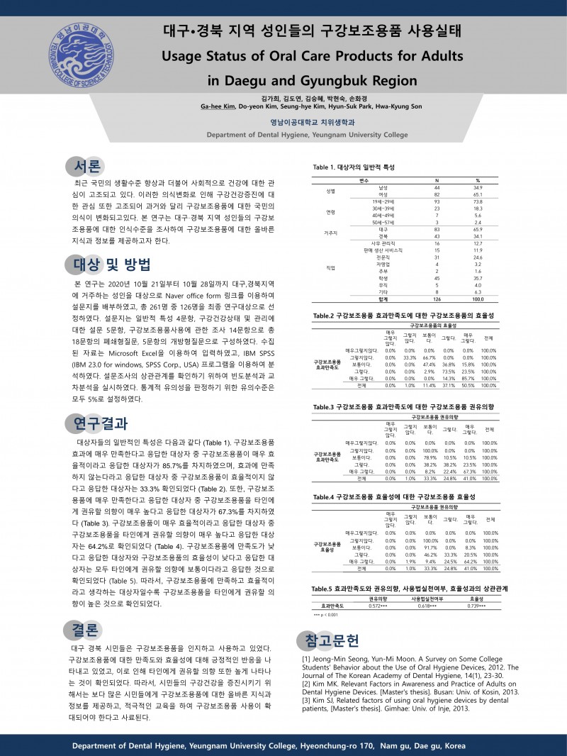2021 종합학술대회 학생포스터 26. 대구·경북 지역 성인들의 구강보조용품 사용실태 페이지 정보 작성자 한국치위생학회 작성일21-10-30 20:49 조회1,079회 댓글0건 관련링크 이전글 다음글 목록 본문 2021 종합학술대회 학생포스터 26. 대구·경북 지역 성인들의 구강보조용품 사용실태 [이 게시물은 한국치위생학회님에 의해 2021-10-30 21:46:46 학술대회참가용 자료에서 복사 됨] 댓글목록 등록된 댓글이 없습니다. 이전글 다음글 목록