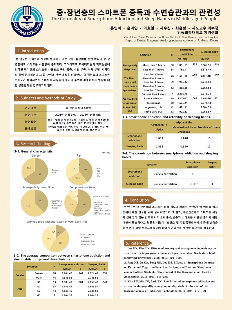 2021 종합학술대회 학생포스터 9. 중·장년층의 스마트폰 중독과 수면습관과의 관련성 페이지 정보 작성자 한국치위생학회 작성일21-10-30 20:23 조회1,077회 댓글0건 관련링크 이전글 다음글 목록 본문 2021 종합학술대회 학생포스터 9. 중·장년층의 스마트폰 중독과 수면습관과의 관련성 [이 게시물은 한국치위생학회님에 의해 2021-10-30 21:47:16 학술대회참가용 자료에서 복사 됨] 댓글목록 등록된 댓글이 없습니다. 이전글 다음글 목록