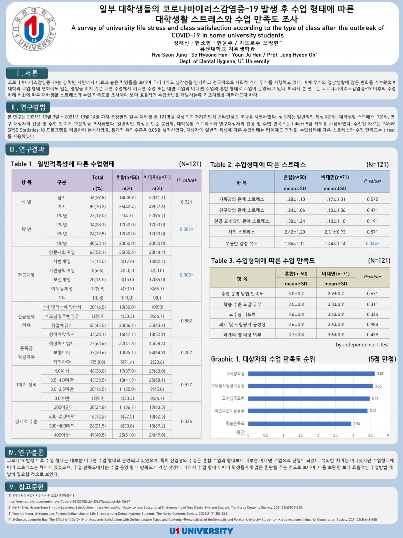 2021 종합학술대회 학생포스터 38. 일부 대학생들의 코로나바이러스감영증-19 발생 후 수업 형태에 따른 대학생활 스트레스와 수업 만족도 조사