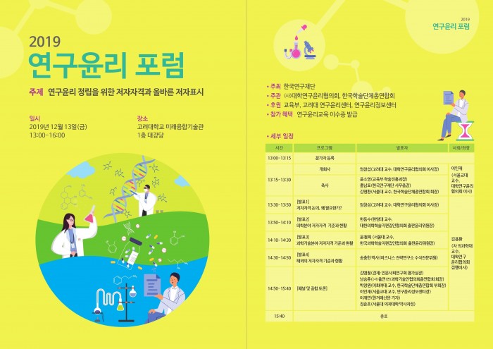 [한국연구재단] 2019 연구윤리 포럼 개최 안내 페이지 정보 작성자 한국치위생학회 작성일19-12-09 21:05 조회4,953회 댓글0건 관련링크 이전글 다음글 목록 본문 한국연구재단에서는 정직하고 책임 있는 연구문화 조성 및 연구윤리 확립을 위한 국가 정책 추진의 일환으로 「2019 연구윤리 포럼」을 개최하고자 합니다. 관심 있는 분들의 많은 참석 부탁드립니다. 감사합니다. 댓글목록 등록된 댓글이 없습니다. 이전글 다음글 목록