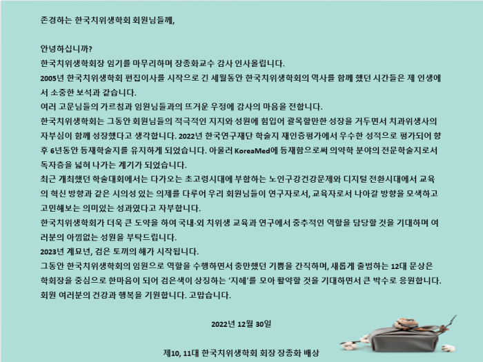 한국치위생학회 10,11대 임기를 마무리하며 페이지 정보 작성자 한국치위생학회 작성일22-12-30 13:29 조회4,223회 댓글0건 관련링크 이전글 다음글 목록 본문 한국치위생학회 10,11대 학회 임기를 마무리하며 감사의 인사 드립니다. 댓글목록 등록된 댓글이 없습니다. 이전글 다음글 목록